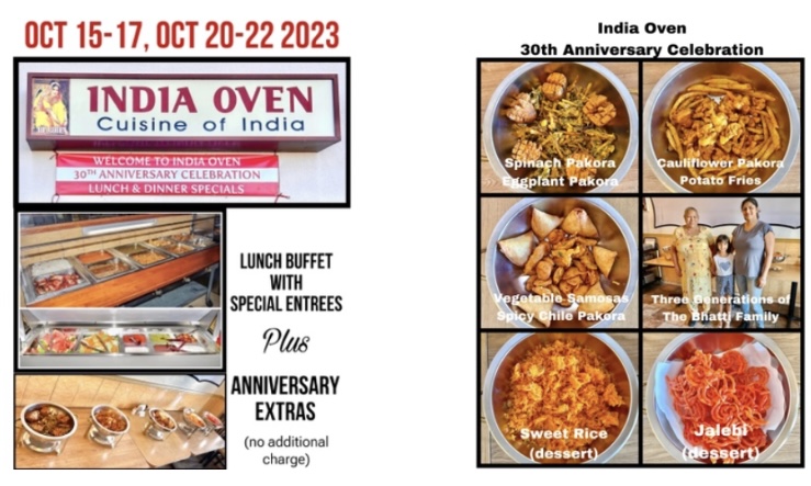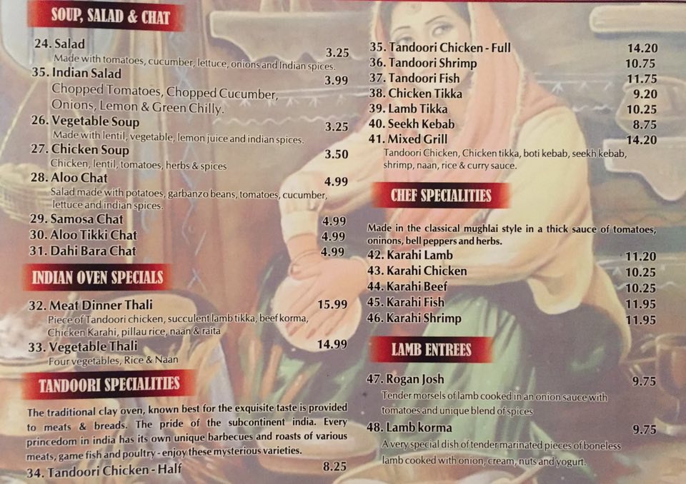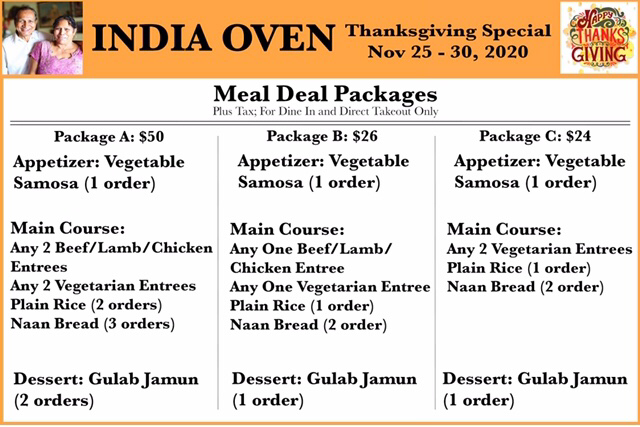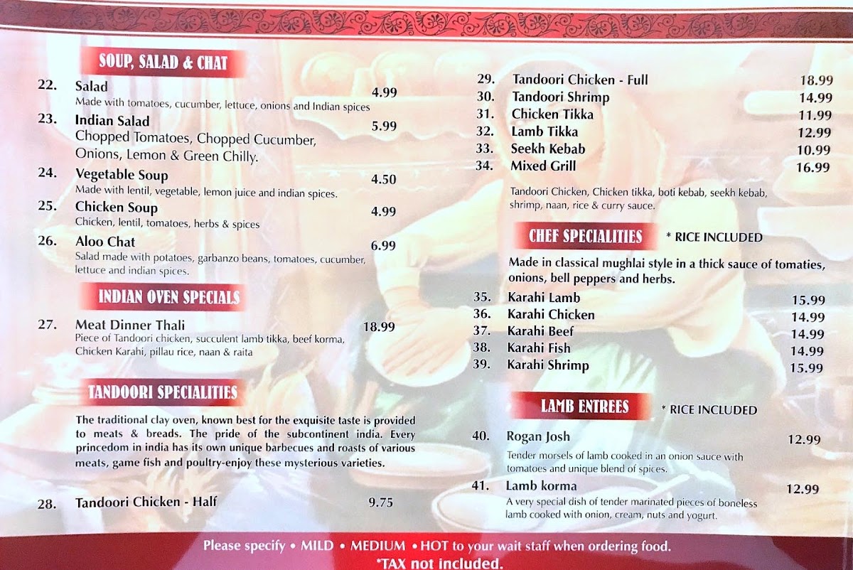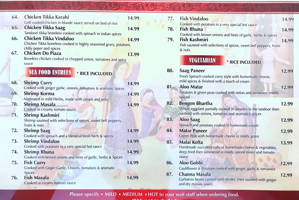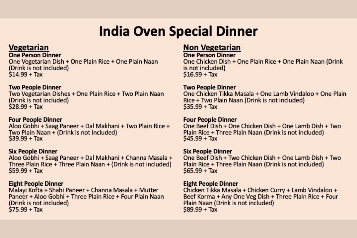 Chicken tikka masala + chicken curry + lamb vindaloo + beef korma + any one veg dish + three plain rice + four plain naan (drink is not included).