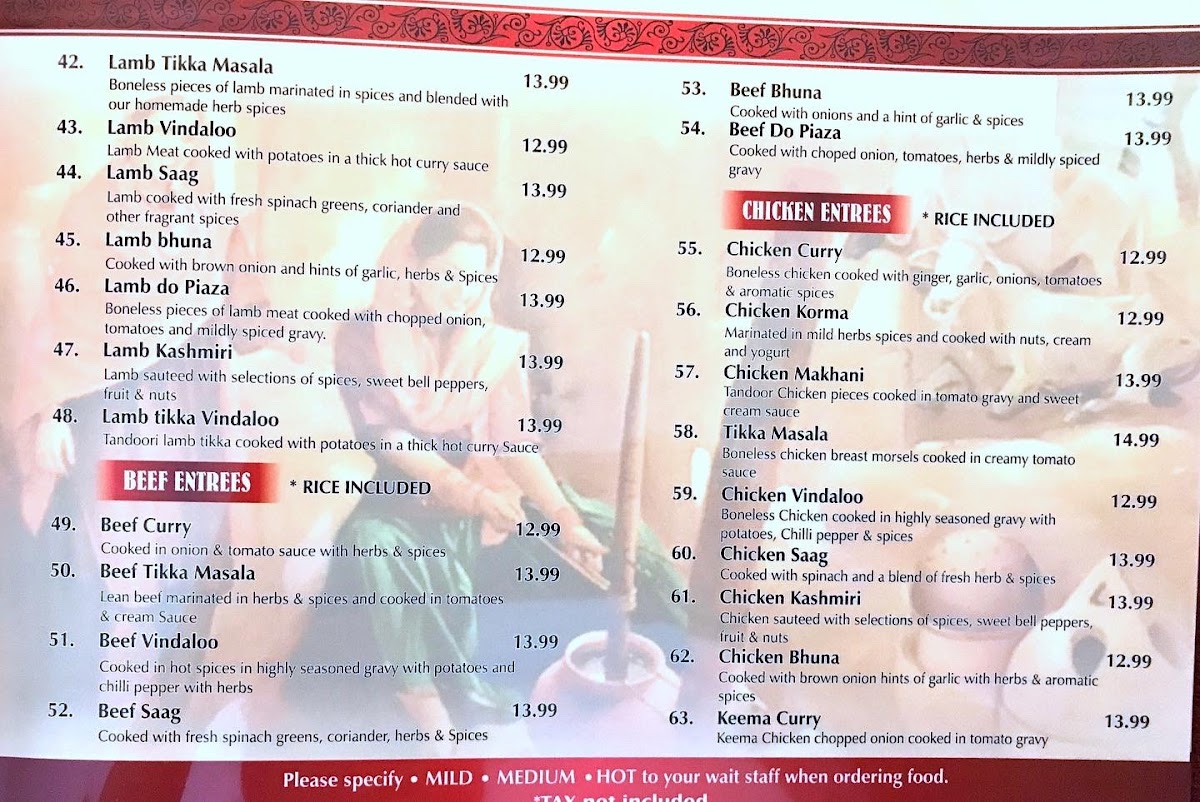 One beef dish + two chicken dish + one lamb dish + two plain rice + three plain naan (drink is not included).