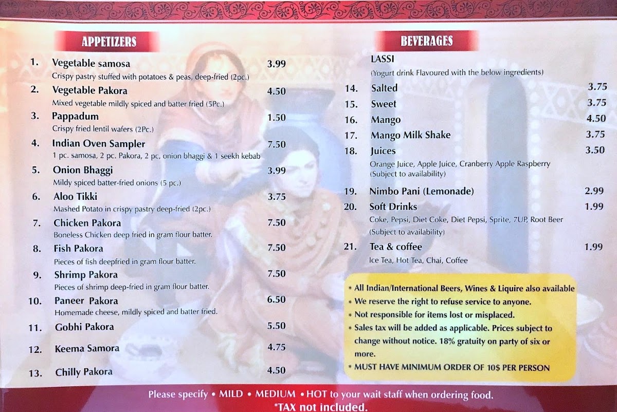 1 pc. samosa, 2 pc. pakora, 2 pc. onion bhaji, and 1 seekh kebab.